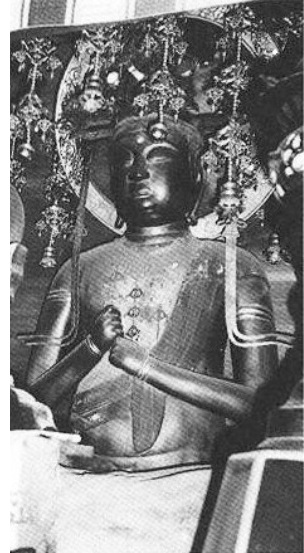 式終了後堂内の数体の仏像が隣接の福祉会館に移された。最後に部屋の隅に埃にまみれた小さな木箱が見つかりその中には12糎程の小型の金属製のずっしりとし重い人物像が安置されていた。この像の背中には「宝亀5年甲寅6月15日御誕生」とはっきりと刻まれていた。